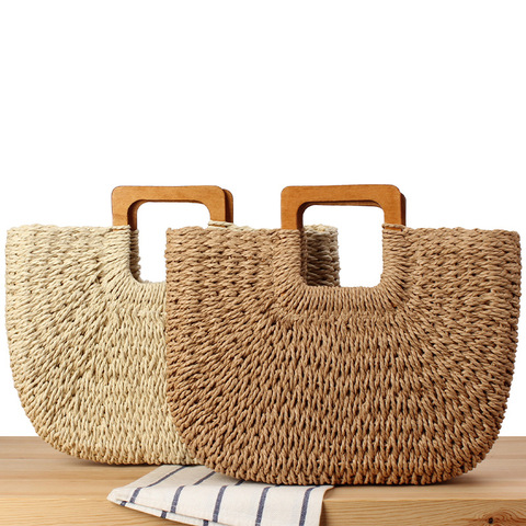Wholesale New Wooden Handle Handmade Straw Bag Summer Beach Large Capacity Paper Straw Bag